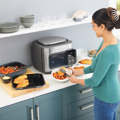 Der Ninja Combi Multikocher SFP700EU verfügt über eine innovative, leicht zugängliche Tür und 12 vielseitige Funktionen. Er nutzt die Kraft von überhitztem Dampf, um Lebensmittel schnell zu garen. Vom Luftgaren bis zum Garen von Tiefkühlgerichten, vermeidet er den Stress, eine große Menge zu kochen und viele Geräte zu benutzen. Mit 12,5 Litern Fassungsvermögen des Combi können ein Hauptgericht und Beilagen gleichzeitig zubereitet werden, für ein dreiteiliges Familienessen in nur 15 Minuten. Und da es sich um einen Multikocher, eine Heißluftfritteuse und einen Ofen in einem handelt, wird der Umluftofen oder das Kochfeld oft überflüssig werden. Die HyperSteam- und Air Fry-Technologien liefern mit den Funktionen Combi Meals, Combi Crisp und Combi Backen schnelle Kochergebnisse, bis zu 50% schneller als mit einem herkömmlichen Ofen.