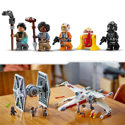 Für Fans von Star Wars und Lego kommt hier ein besonderes Set mit ungewohnten Raumschiff-Kombinationen: Aus 1063 Teilen entstehen ein "TIE-Wing" und ein "X-Fighter". Beide Raumschiff-Modelle haben ein aufklappbares Cockpit für eine Lego-Minifigur und zwei Shooter mit Federmechanismus. Einfach die Sicherungsstifte herausnehmen, um die Flügel vom Rumpf des einen Bauspielzeugs zu lösen und an dem jeweils anderen Modell zu montieren - so entstehen der legendären TIE-Fighter und der berühmte X-Wing. Die Flügel des „TIE-Wings“ und des „X-Fighters“ können in den Flug- oder Angriffsmodus geschwenkt werden. Und am Modell des X-Wings lässt sich das Fahrwerk einziehen. Das Set enthält außerdem 4 Lego-Minifiguren: Einen Rebellenpilot und einen TIE-Pilot, die beide eine Blaster-Pistole tragen, Yesi Scala, der einen Gaderffi hält, sowie Sig Greebling und den Lego Droiden L3-G0.