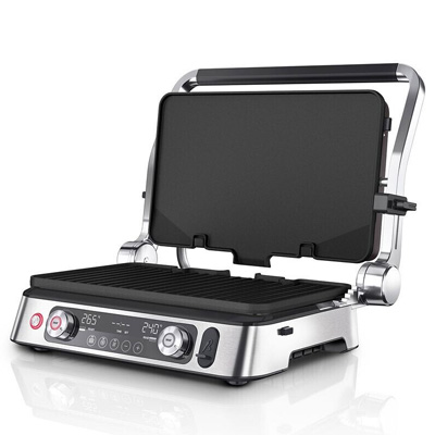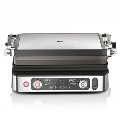 Der Braun MultiGrill 9 Pro CG 9167 Kontaktgrill + Waffelautomat in elegantem Schwarz und Edelstahl ist ein vielseitiges Küchengerät für perfekte Grillergebnisse. Mit einer Leistung von 2200 W bietet dieser Multigrill optimale Grillleistung und verfügt über 3-in-1 Grillpositionen. Die große Grillfläche eignet sich für bis zu 8 Personen und spülmaschinenfeste Teile erleichtern die Reinigung. Zu den technischen Daten gehören eine Spannung von 220-240 V, eine Höhe von 18,0 cm, eine Breite von 35,5 cm, eine Länge von 44,5 cm und ein Gewicht von 12 kg. Das Set enthält 2 Grillplatten und den Multigrill. Mit integrierter Fettauffangschale, individuell einstellbaren Temperaturen und Boost-Funktion für saftiges Fleisch. Genießen Sie maximale Flexibilität mit 3 Grillpositionen (Kontakt, BBQ, Ofen) und automatischen Programmen für Hamburger, Panini und Warmhalten. Die Aluminiumguss-Grillplatten sind spülmaschinenfest und das Display zeigt die Temperatur an.