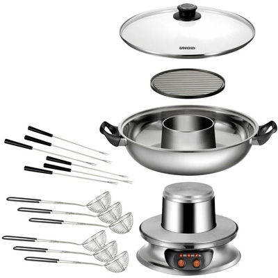Das Unold Asia-Fondue 48746 bietet eine Doppelfunktion: Während auf der Grillplatte Gambas oder kleine Steaks zubereitet werden, garen in aromatischer Gemüsebrühe Brokkoliröschen, Seeteufel-Filets oder Hähnchenbrust-Stücke. Weil Fondue- und Grillfunktion getrennt schaltbar sind, kann natürlich auch mal ein reines Fondue stattfinden – dafür stehen zwei Temperaturstufen (bis zu 1.950 Watt) zur Verfügung. Der großzügige Fonduetopf ist aus hochwertigem Edelstahl gefertigt. Ein schicker Glasdeckel gehört auch dazu. Wenn mal eine Essenspause eingelegt werden soll, ganz einfach den Deckel auflegen und die Temperatur runterschalten. Zur bequemen Reinigung ist das Asia-Fondue 48746 komplett zerlegbar, außerdem sind alle nicht-elektrischen Teile spülmaschinengeeignet. Das Zubehör ist auf alle kulinarischen Anforderungen eingestellt: Sechs Körbchen, mit denen man zum Beispiel Gemüsestücke oder in Teig gewälzte Champignonköpfe immer sicher im Griff hat, und sechs farbig markierte Gabeln für Fleisch- oder Fischstücke sind ebenso serienmäßig wie die Bedienungsanleitung mit inspirierenden Rezepten.