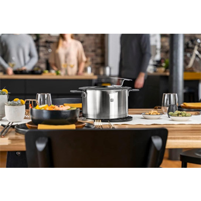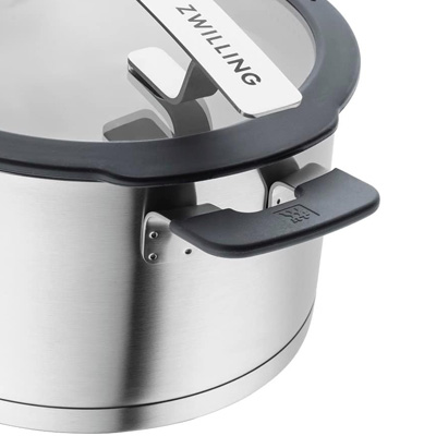 Die Kochgeschirr-Serie Simplify steht für Design und Funktionalität. Das 5-teilige Kochtopfset überzeugt nicht nur durch seine außergewöhnliche Optik, es begeistert auch mit innovativen Eigenschaften. Dank der integrierten Deckelhalterung können die Glasdeckel während des Kochens oder Servierens am Topf befestigt werden, sodass sie keinen Platz wegnehmen und Kondenswasser, das sich an der Glasfläche gesammelt hat, in den Topf zurück und nicht auf den Tisch oder den Herd tropft. In die Silikonumrandung der Deckel ist ein Sieb mit zwei unterschiedlich großen Öffnungen integriert, sodass Flüssigkeit ohne zusätzliches Sieb abgegossen werden kann. Auch die Griffe sind mit Silikon ummantelt und werden so auch während des Kochens nicht zu heiß, um sie anfassen zu können. Ein X am Deckel markiert die optimale Deckelstellung zum Reduzieren des Dampfaustritts. Das Kochgeschirr aus 18/10 Edelstahl ist hochwertig verarbeitet und der SIGMA Classic + Sandwichboden sorgt für eine ideale Wärmeverteilung. Alle fünf Kochtöpfe sind spülmaschinengeeignet und induktionsgeeignet.