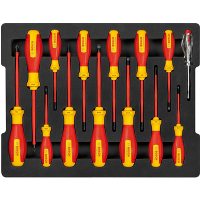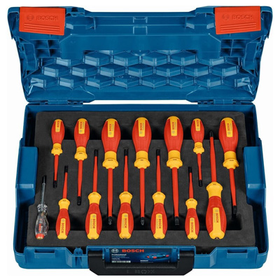 Professionelle Handwerker brauchen Werkzeuge, die leicht anzuwenden sind und allen gesetzlichen Vorgaben entsprechen. Mit dem gemischten Bosch Professional VDE-Schraubendreher-Set TX mit einpoligem Phasenprüfer (14-tlg.) lassen sich Schrauben auch bei unerwartetem Kontakt mit stromführenden Teilen anziehen und lösen. Die Schraubendreher sind mit thermoplastischem Elastomer (TPE) isoliert, ihre S2-Klingen haben eine isolierende Schutzbeschichtung und ihre Griffe handfreundliche Softgripflächen. Zusätzlich kommt das Set mit einer Schaumeinlage sowie eine praktischen L-Boxx zur Aufbewahrung.