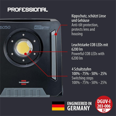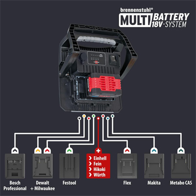 Der extrem robuste und leistungsstarke Multi Battery LED Hybrid Strahler 6050 MH für den professionellen Einsatz sorgt für maximale Flexibilität im Handwerk dank dem Brennenstuhl Multi Battery 18V System. Dadurch bietet der Arbeitsstrahler noch mehr Effizienz durch Kompatibilität zu fünf 18V Akku-Systemen der Powertool-Hersteller Bosch Professional, Makita, Metabo, Dewalt und Milwaukee. Ganz egal also welches Akku-System bereits im Einsatz ist, das Brennenstuhl Multi Battery 18V System ermöglicht eine volle Kompatibilität. Der Baustrahler mit innovativer Schnittstellen-Technologie ermöglicht dank Hybridtechnik einen Akku- und Netzbetrieb. Mit 60 Watt Leistung und 6200lm bietet der Arbeitsstrahler auch eine tolle Ausleistung des Arbeitsplatzes.