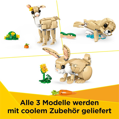Schicke Mädchen und Jungen ab 8 Jahren, die Tiere lieben, mit dem Lego Creator Häschen (31162) aus diesem 3-in-1-Bauset in lustige Abenteuer. Das Spielset beinhaltet ein Spielzeughäschen, das Kopf, Ohren, Vorderläufe und Hinterläufe bewegen kann. Die Figur kann auf 2 oder 4 Beinen stehen. Zum Set gehören auch eine Sonnenblume und eine Karotte. Mädchen und Jungen können 3 verschiedene Tiere mit den Steinen aus diesem Lego Spielset bauen: ein bewegliches Häschen mit Sonnenblume und Karotte, ein bewegliches Lama mit einem grünen Grasbüschel und eine Robbe mit einer kleinen Eisscholle und einem Fisch.