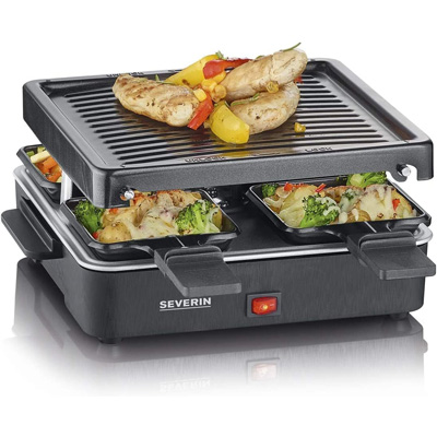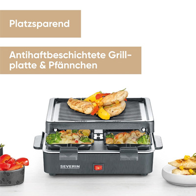 Das Mini Raclette-Grill RG 2370 bietet Partyspaß für bis zu 4 Personen. Der kompakte Raclette-Grill mit gerillter Grillplatte läd zur kreativen Zusammenstellung von überbackenen Köstlichkeiten ein. Dank der antihaftbeschichteten Grillplatte lässt sich ohne die Zugabe von Fett gesund grillen. Zur einfachen Speisenentnahme und Reinigung sind auch die Pfännchen antihaftbeschichtet. Die Bedienung erfolgt über einen Ein- und Aus-Schalter mit integrierter Kontrollleuchte. Für eine sichere Nutzung verfügt der Mini Raclette-Grill RG 2370 über ein hochwertiges, wärmeisoliertes Kunststoffgehäuse und rutschfeste Standfüße. Durch die kompakten Maße lässt sich der Mini Raclette-Grill leicht und platzsparend verstauen.