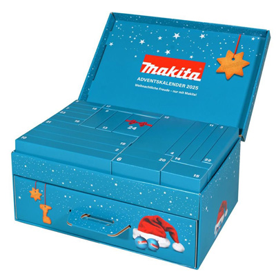 Der offizielle Adventskalender von Makita bringt Erwachsenenaugen zum Leuchten. Hinter den 24 Türchen verbirgt sich eine gelungene Geschenkkombination aus Werkzeugen, wichtigem Zubehör und exklusiven Makita Fan-Artikeln. Der Adventskalender ist ein tolles Geschenk für alle Makita- und Werkzeugbegeisterten und kann auch ideal mit Gutscheinen als Geschenk kombiniert werden. Das Adventskalender-Set beinhaltet das 60-teilige Bohrer- und Bit-Set E-15095, das 5-teilige Impact Premier Bit-Set E-13568, das 5-teilige TCT Multibohrer-Set E-14255, eine LED-Stiftlampe, zwei Makita Keksausstecher, einen Makita Schlüsselanhänger in Akku-Schrauber-Form, einen Makita Kühlschrankmagneten, Makita Schnürsenkel, eine Makita Wasserwaage und einen Makita Flaschenöffner in XGT-Akkuform.