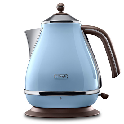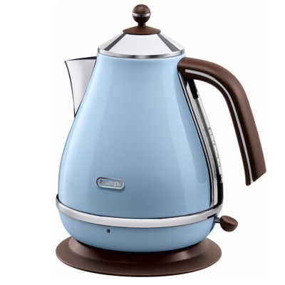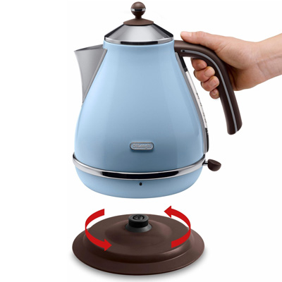 Der DeLonghi Icona Vintage Wasserkocher ein formschöner Wasserkocher im Retrodesign mit 1,7 Liter Fassungsvermögen. Der schöne, hellblaue Edelstahlkessel ist kabellos von der Basisstation abnehmbar und hat ein flaches, verdecktes Edelstahl-Heizelement, was die Reinigung des Kessels erheblich erleichtert. Die Leistung von 2000 Watt und der dreifache Sicherheitsschutz überzeugen einen rasch von den Qualitäten des DeLonghi Wasserkochers. Der Wasserkocher hat die Wasserstandsanzeige hinten am Griff und ist so sowohl für Links-, als auch für Rechtshänder geeignet.