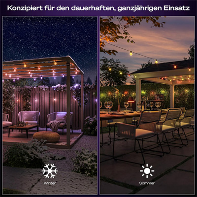 Schaffe mit der Philips Hue Festavia Globe Außenlichterkette ein gemütliches Licht oder eine farbenfrohe Partyatmosphäre auf deiner Terrasse, Veranda oder einem anderen Ort mit Außenbeleuchtung. Diese Lichterkette aus bruchsicheren kugelförmigen Lampen strahlt brillante Farben aus und lässt sich mit der Hue-App steuern: kreativ, mit Farbverlauf oder zur Wiedergabe animierter Lichteffekte.