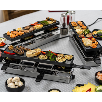 Der Rommelsbacher RC 800 ist ein eleganter Raclette-Grill zum freien Kombinieren bei Tisch, der keine Wünsche offenlässt. Hochwertige Materialien und beste Verarbeitung machen aus diesen Geräten echte Partystars. Das stabile Gehäuse aus Alu-Druckguss sorgt für einen sicheren Stand und die massive Grillplatte bietet beste Wärmeverteilung, wobei die Temperatur ganz nach Bedarf stufenlos einstellbar ist. So gelingen auf der Grillplatte Fleisch und Würstchen, aber auch Fisch und Gemüse perfekt; gleichzeitig können in den 4 Pfännchen je Gerät verschiedene Snacks überbacken und Raclette-Käse geschmolzen werden.