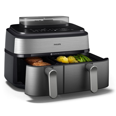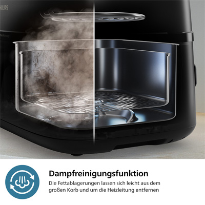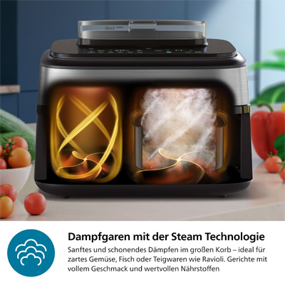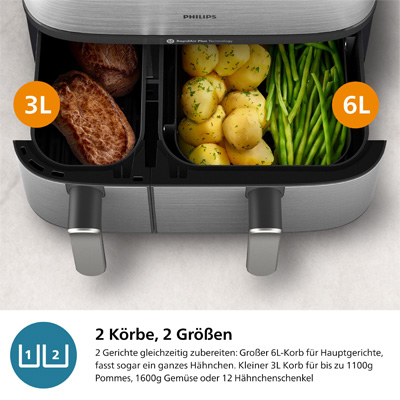 Der Philips NA555/00 Airfryer mit zwei Körben ermöglicht eine knusprige und gleichmäßige Zubereitung der Lieblingsgerichte mit bis zu 90% weniger Fett. Während er für Hauptspeisen und Pommes frites einen Korb mit 6 Liter Fassungsvermögen besitzt, eignet sich der kleinere Korb mit 3 Liter ideal für Beilagen und Snacks. Dank der Rapid Air Plus Heißlufttechnologie und des einzigartigen sternförmigen Designs werden die Speisen gleichmäßig und schneller innen und außen gegart. Durch die Air Steam-Technologie sorgt der Airfryer für eine gute Dampfzufuhr für Gemüse und Fisch. Damit die unterschiedlichen Gerichte gleichzeitig fertig werden, ist er mit einer praktischen Timer-Funktion ausgestattet.