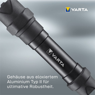 Die Leuchten der Serie Indestructible Pro von Varta meistern so gut wie jede Herausforderung. Sie verfügen über ein stoßfestes Gehäuse mit eloxiertem Aluminium und gummierten Elementen, die sie extrem robust, wasserfest und staubdicht machen. Die F30 Pro ist eine Taschenlampe mit einer Lichtleistung von bis zu 650 Lumen und zwei Leuchtstufen, die mit 6 AA-Batterien auf eine Leuchtdauer von bis zu 75 Stunden und eine Leuchtweite von bis zu 279 Metern kommt. Linse und Reflektor sind bruchfest.