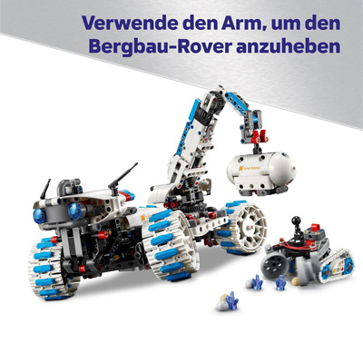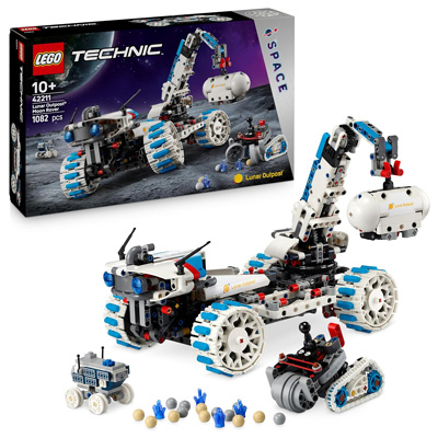 Dieses faszinierende Raumfahrtspielzeug lässt Jungen und Mädchen ab 10 Jahren besonders fantasievoll spielen. Das Set ist echten Lunar Outpost Fahrzeugen nachempfunden, die dem Menschen die Rückkehr auf den Mond ermöglichen. Lego Technic Lunar Outpost Mondrover-Raumfahrzeug (42211) beinhaltet einen Mondrover, einen Schürfrover und einen MAPP-Rover, die Kinder zu unzähligen Erkundungsmissionen aufbrechen lassen. Das futuristische Hauptmodell ist ein geländegängiger Mondrover mit Schwingenaufhängung, 4-Rad-Lenkung, ausfahrbaren Solarmodulen und drehendem Greifarm. Mit dem Greifarm kannst du den kleineren Schürfrover absetzen, um ihn Mondregolith (Mondgestein) aufsammeln zulassen. Bewahre die Gesteinsproben in dem Behälter auf. Schick dann den MAPP-Rover los, um weitere Informationen über die Mondoberfläche zu sammeln.