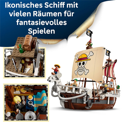 Ein Lego-Set für Anime-Fans und der Serie "One Piece": Aus 1376 Teilen entsteht ein Modell des Piratenschiffs "Flying Lamb" - bekannt aus der Netflix-Serie! In dem Schiff sind mehrere Räume untergebracht: eine Kabine für die Crew, eine Kombüse, ein Lagerraum und eine Werkstatt. Zu dem Modell gehören auch 5 Minifiguren: Ruffy sitzt über einer Kanone auf der Schaf-Galionsfigur am Bug. Zorro relaxt und trainiert auf dem Deck. Nami steht am Steuer am Heck, wo ihre geliebten Mandarinenbäume auf dem Deck wachsen. Lysop klettert die Masten hinauf und hält im Ausguck Ausschau nach anderen Schiffen. Und Sanji trägt Töpfe in die Kombüse hinunter. Auch 4 Steckbriefe sind mit dabei.