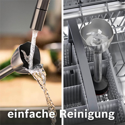 Der Stabmixer Bosch MSM4B610 ErgoMaster bietet eine ideale Kombination aus Kraft und Kontrolle. Dank einer Kupplung aus Keramik wird die Kraft an das Messer ohne Abriebeffekt übertragen. Der 1000-Watt-Motor bietet starke Leistung, auch für die härtesten Herausforderungen. Der ErgoMaster lässt sich dabei intuitiv und einhändig durch Druck auf den Bedienhebel steuern. So zerkleinert, mixt und verrührt der ErgoMaster Lebensmittel im Handumdrehen. Der Mixfuß ist mit dem Bosch QuattroBlade System mit AntiSplash Funktion ausgestattet. So lässt sich effizient Mixen ohne Unterbrechungen oder Spritzer.