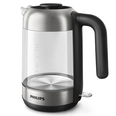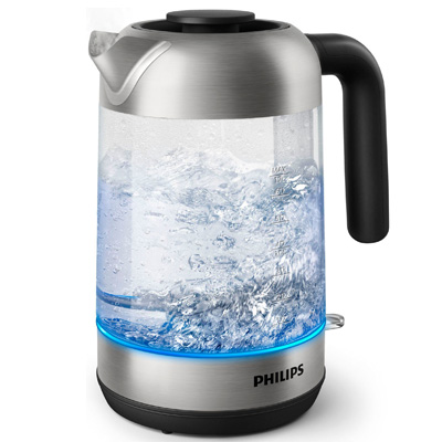 Ein schnelles und sicheres Erhitzen ermöglicht der Philips Series 5000 Wasserkocher HD9339/80 aus Glas. Er zeichnet sich durch modernes Design aus und besitzt ein blaues Sensorlicht im Sockel, das bei Einschaltung des Gerätes aufleuchtet. Für kochend heißes Wasser in Sekundenschnelle sorgt das integrierte, flache Heizelement. Der Wasserkocher ist zudem mit einem Mikro-Sieb-Filter ausgestattet, das auch kleinste Kalkpartikel aufnimmt und so für klares Wasser sorgt. Durch sein mehrstufiges Sicherheitssystem mit Trockengehschutz schaltet sich das Gerät automatisch ab, wenn das Wasser kocht. Da es auf einer 360°-Pirouettenbasis sitzt, punktet es mit komfortablem Anheben und Aufsetzen.