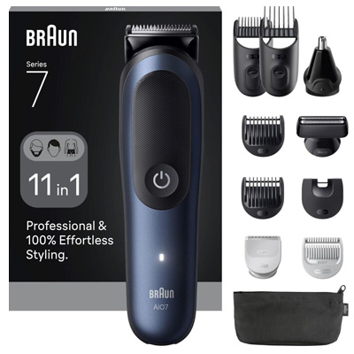 Das Braun Series 7 7540 All-in-One Trimmer Set bietet professionelles und müheloses Styling für Bart, Haare, Körper, Ohren und Nase – für grenzenlose Vielseitigkeit und präzise Ergebnisse. Der Barttrimmer bietet 14 Längeneinstellungen von 3–21 mm, ideal für perfekte Konturen und eine saubere Rasur, während die SkinGuard-Technologie sensible Haut schützt. Genießen Sie bis zu 120 Minuten kabellose Laufzeit mit dem langlebigen Li-Ion-Akku, und absolute Kontrolle dank des wasserdichten AquaGrip-Griffs, sogar unter der Dusche. Das Set beinhaltet 9 Aufsätze, darunter Bart-, Körper-, Ohr-, Augenbrauen- und Nasenhaartrimmer, sowie eine Ladestation, Reinigungsbürste, Kammaufsatz und Aufbewahrungstasche.