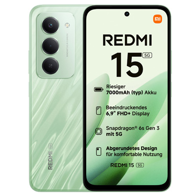 Das Xiaomi Redmi 15 5G beeindruckt mit großem Display und liefert dank seines riesigen Akkus überzeugende Laufzeiten. Der Touchbildschirm hat eine Diagonale von 17,5 Zentimetern (6,9") und löst mit 1080 x 2340 Pixeln auf. Seine Wiederholrate von 144 Hz sorgt für flüssiges Scrollen. Mit bis zu 850 cd/m² Spitzenhelligkeit ist das Display außerdem stets gut ablesbar und dank Wet-Touch-Technologie auch mit feuchten Händen gut bedienbar. Der Qualcomm Snapdragon 6s Gen 3 Achtkern-Prozessor liefert überzeugende Rechenleistung und liefert im Handynetz 5G-Geschwindigkeit. Mit der 50 MP Hauptkamera und 8 MP Selfie-Kamera gelingen tolle Erinnerungs-Schnappschüsse. Das Gehäuse des Redmi 15 5G ist nach IP64 gegen Beschädigungen geschützt. Der interne Speicher kann mit einer microSD-Karte erweitert werden. Und dank seines extragroßen Akkus mit 7000 mAh hat dieses Smartphone immer reichlich Power mit an Bord.