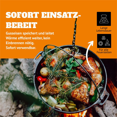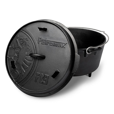 Der Feuertopf ft9 von Petromax eignet sich für 8-14 Personen. Die Petromax Feuertöpfe, auch als Dutch Oven bezeichnet, sind ideale Begleiter für Draußen-Aktivitäten wie Reisen, Camping, etc. Mit ihnen garen Speisen, wie z.B. Fleisch und Gemüse, sehr schonend im eigenen Saft über offenem Feuer oder im heimischen Backofen. Der einzigartige Geschmack entsteht durch die konstante Rundumwärme im Topf. Die Deckel der Feuertöpfe können zudem auf Wunsch als Servierplatte oder Pfanne genutzt werden. Dank der vorbehandelten Oberfläche (seasoned finished) ist der robuste Petromax Feuertopf aus Gusseisen sofort verwendbar. Mit den Petromax Feuertöpfen kann man draußen leckeres und gesundes Essen für Familie und Freunde zubereiten.