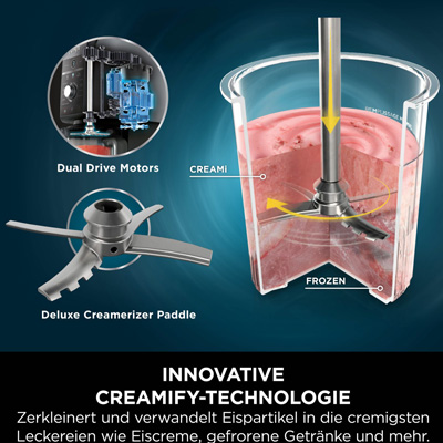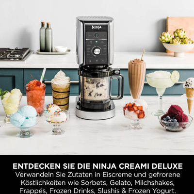 Die Ninja CREAMi Deluxe Eismaschine NC502EU kann fast alles in Eiscreme verwandeln und noch viel mehr. Neben den CREAMi-Klassikern wie Eiscreme, Sorbet, Gelato und Mix-in-Meisterwerke kann sie auch Slushies, Frappes, Frozen Yoghurt und Frozen Drinks direkt zu Hause zubereiten. Die fortschrittliche CREAMify-Technologie mit Dual-Drive-Motoren übt Druck nach unten aus und dreht den professionellen Creamerizer-Paddle, der die Eispartikel fein hobelt und in köstliche Leckereien verwandelt. Die Eis- und Getränkemaschine kann außerdem zuckerarme, laktosefreie und vegane Versionen aller Lieblingsspeisen herstellen. Mit den zusätzlichen Funktionen Slushi, Frozen Drink, Frappe und Frozen Yoghurt kann die CREAMi ganz neue Leckereien zum Löffeln und Trinken zubereiten.