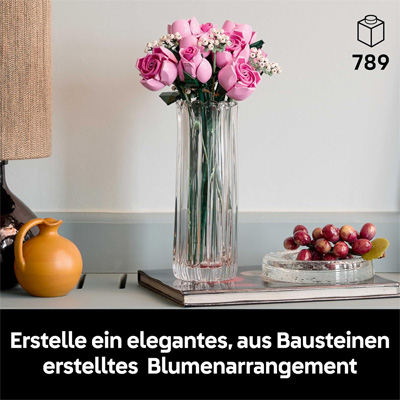 Der Lego Botanicals Rosa Rosenstrauß (10374) ist ein wunderschönes Bauset für Erwachsene, das dich eine elegante Blumendeko aus Lego Steinen erschaffen und all ihre Details bestaunen lässt. Freu dich auf ein faszinierendes Bauprojekt und steck den Lego Strauß aus 12 rosafarbenen Rosen in unterschiedlichen Blühstadien zusammen. Entdecke 4 Rosen in voller Blüte, 4 aufgehende Rosen und 4 Rosenknospen. Verschiedene Rosatöne sorgen für einen authentischen Farbverlauf. Vollendet wird das Arrangement durch 4 Schleierkrautzweige mit weißen Blüten. Du kannst das Set allein oder zusammen mit deinen Liebsten bauen, denn es liegen 3 Bauanleitungen bei. Dieses Gemeinschaftsprojekt eignet sich ideal für einen Date-Abend, einen Familientag oder als kreative Aktivität mit Freundinnen und Freunden. Nach Abschluss des Bauprojekts kannst du die hübschen Blumen in einer Vase ausstellen und jedem Raum einen Hauch von Farbe verleihen.