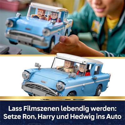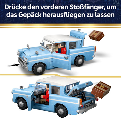 Dieses legendäre Auto (76470) zum Bauen, Spielen und Ausstellen lässt junge Zauberer, Hexen und Muggel die Magie des Fliegenden Ford Anglia der Weasleys mit den eigenen Händen nachstellen. Dieses bisher detailreichste Lego Modell des legendären Autos ist ein fantastisches Harry Potter Geschenk für Jungen, Mädchen und alle Fans ab 14 Jahren. Setz die Figuren Ron Weasley und Harry Potter zusammen mit Harrys Eule Hedwig ins Auto, um Szenen aus Harry Potter und die Kammer des Schreckens zum Leben zu erwecken. Aktiviere magische Funktionen, um den Kofferraumdeckel und die Türen aufspringen und das Gepäck unserer Helden genau wie im Film aus dem Kofferraum herausfliegen zu lassen.