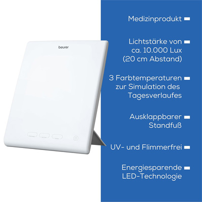 Die Perfect Day Tageslichtlampe TL 45 simuliert natürliches Sonnenlicht und sorgt damit für Wohlbefinden in den sonnenarmen Monaten. Es können drei verschiedene Farbtemperaturen eingestellt werden, die der Sonneneinstrahlung zu bestimmten Tageszeiten ähnlich sind. im Therapie-Modus erreicht sie eine Lichtstärke von 10000 Lux. Diese LED-Leuchte ist filmmerfrei und UV-frei und wird komfortabel per Touch-Button bedient.