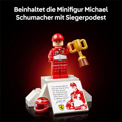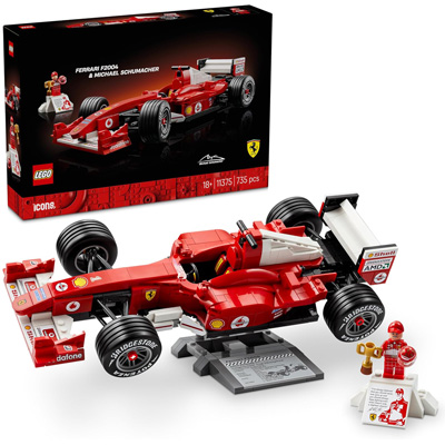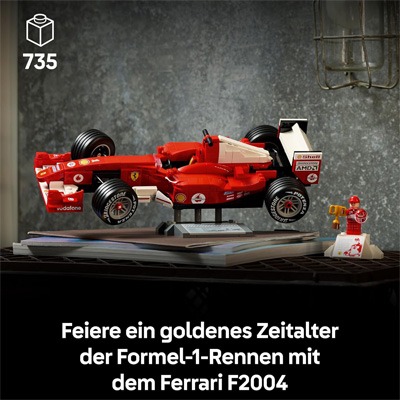 Feiere das goldene Zeitalter der Formel-1-Rennen mit Lego Icons Ferrari F2004 und Michael Schumacher (11375). Baue eine maßstabsgetreue Nachbildung des legendären Rennautos mit Michael Schumacher am Steuer, der die Formel-1-Saison 2004 dominierte. Das Ferrari-Modell hat eine funktionierende Lenkung, Rennreifen mit Profil und einen detailgetreuen V10-Motor. Auf dem Ständer kann man die technischen Daten des Flitzers lesen. Die Minifigur Michael Schumacher trägt einen Helm und einen Siegerpokal und steht auf einem Siegerpodest. Auf diesem Podest sind ein Bild und ein Zitat des siebenfachen Weltmeisters aufgedruckt. Dieses Premium-Modell ist ein imposanter Hingucker und ein fantastisches Weihnachts- oder Geburtstagsgeschenk für Fans der F1-Rennen, die gern F1-Fanartikel sammeln. Das Set besteht aus 735 Teilen.