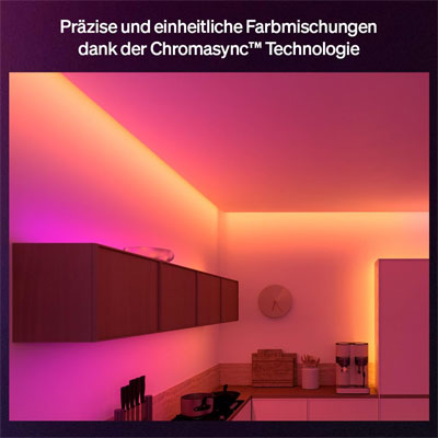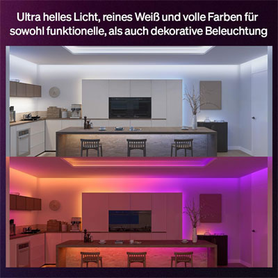 Mit dem ultrahellen Philips Hue Flux Lightstrip in 5 Meter Länge kannst du jeden Innenraum mit ultrahellem, echtem Weißlicht dekorieren oder beleuchten, um deine täglichen Aufgaben zu erledigen, oder mit kräftigen und leuchtenden Farben für beeindruckende Momente im Alltag sorgen. Die Chromasync™ Technologie sorgt für präzise Farbanpassung und gleichmäßige Farbverläufe. Flexible Installation – du kannst den Lichtstreifen zuschneiden, wiederverwenden und erweitern, um ihn an jeden Innenraum anzupassen. Komplett anpassbare Beleuchtung, die du über die preisgekrönte Hue App oder per Sprachbefehl über deinen bevorzugten Smart-Home-Assistenten steuern kannst.