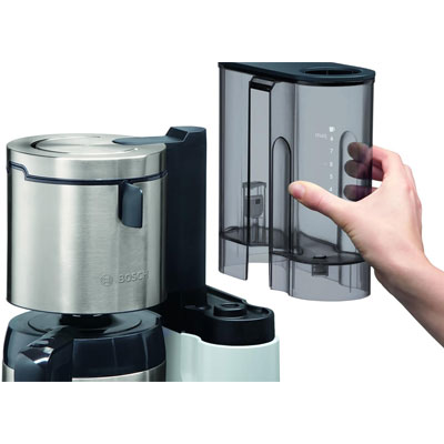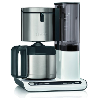 Die Bosch TKA8A681 ist eine moderne, elegante Filterkaffeemaschine aus der Styline-Serie. Ihre Edelstahl-Thermokanne und -Filtergehäuse zeichnen sich nicht nur durch Optik, sondern auch Funktionalität aus. So bleibt der Kaffee aromaschonend heiß. Dies verdankt er vor allem der VolumeAutomatic Technologie für ein optimales Kaffeearoma - auch bei kleinen Brühmengen. Die TKA8A681 besitzt einen Timer mit Memory und Uhrfunktion, um die Startzeit vorprogrammieren zu können. Als Schutzfunktionen dienen eine automatische Abschaltung direkt nach Brühende und eine Temperatursicherung. Auf Knopfdruck kann die TKA8A681 ein Entkalkungs-Programm starten.