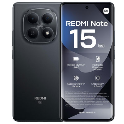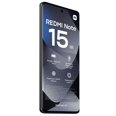 Das Redmi Note 15 5G kombiniert stabile Verarbeitung mit überzeugendem Design - ein starker Partner für die Anforderungen des mobilen Alltags. Das 17,2 cm (6,77") große AMOLED-Display ist mit hochfestem Glas geschützt, das Gehäuse hat einen verstärkten Mittelrahmen und ist nach IP65 gegen Feuchtigkeit abgesichert. Im Innern sitzt ein 5520 mAh großer Akku, der reichlich Energie für den Qualcomm Snapdragon 6 Gen 3 Achtkern-Prozessor und bis zu 3200 cd/m² Displayhelligkeit liefert und mit 45 W TurboCharge schnell aufgeladen werden kann. Über Reverse Charging können anderen Geräte außerdem mit bis zu 18 Watt geladen werden. Außerdem mit an Bord: Eine 108 MP-Hauptkamera erzeugt ultraklare Bilder - für dynamische Schnappschüsse und mit umfassenden AI-Bearbeitungsfunktionen. Die integrierten Lautsprecher sorgen für beeindruckenden Stereosound mit Lautstärke-Boost.