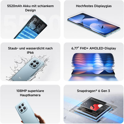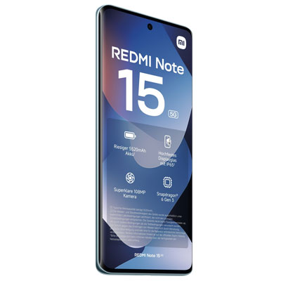 Das Redmi Note 15 5G kombiniert stabile Verarbeitung mit überzeugendem Design - ein starker Partner für die Anforderungen des mobilen Alltags. Das 17,2 cm (6,77") große AMOLED-Display ist mit hochfestem Glas geschützt, das Gehäuse hat einen verstärkten Mittelrahmen und ist nach IP65 gegen Feuchtigkeit abgesichert. Im Innern sitzt ein 5520 mAh großer Akku, der reichlich Energie für den Qualcomm Snapdragon 6 Gen 3 Achtkern-Prozessor und bis zu 3200 cd/m² Displayhelligkeit liefert und mit 45 W TurboCharge schnell aufgeladen werden kann. Über Reverse Charging können anderen Geräte außerdem mit bis zu 18 Watt geladen werden. Außerdem mit an Bord: Eine 108 MP-Hauptkamera erzeugt ultraklare Bilder - für dynamische Schnappschüsse und mit umfassenden AI-Bearbeitungsfunktionen. Die integrierten Lautsprecher sorgen für beeindruckenden Stereosound mit Lautstärke-Boost.