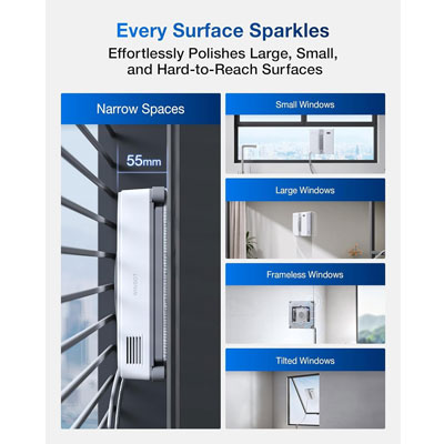 Der schlanke WINBOT MINI von ECOVACS reinigt effizient verschiedene Fenstertypen, effizient und einfach in der Handhabung. Das Klettersystem mit verbessertem Gummiriemen sorgt für stabilen Halt. Das Radsystem reduziert Wasserkontakt für mehr Stabilität. Dank intelligenter Routen- und Sensorsteuerung passt er sich nahtlos an verschiedene Fenstertypen an. Mit Dreifachdüsen und Weitwinkel-Sprühfunktion löst der WINBOT MINI Schmutz effizient und streifenfrei. Sein Ultraschall-Wassersprühsystem reinigt Glasoberflächen schonend bei minimalem Wasserverbrauch, umweltfreundlich und ohne aggressive Reinigungsmittel. Er kehrt nach der Reinigung zum Startpunkt zurück und setzt fort, wo er aufgehört hat. Der WINBOT MINI bietet mit 3.200 Pa Saugkraft, erweiterbar auf 7.500 Pa, effektive Reinigung und flüssige Bewegungen. Sein Anti-Rutsch-System sorgt auch auf rutschigen Oberflächen oder bei Stromausfällen für sicheren Halt.